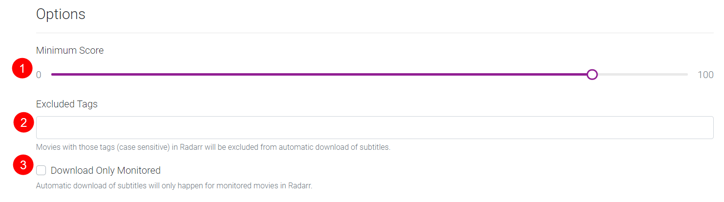 2. Movies with those tags (case sensitive) in Radarr will be excluded from the automatic downloading of subtitles. In Radarr you add a custom tag to a movie.