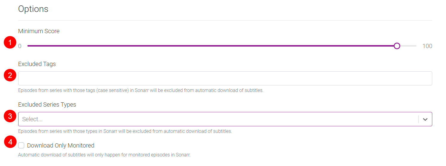 3. Episodes from series with these types in Sonarr will be excluded from automatic downloading of subtitles.