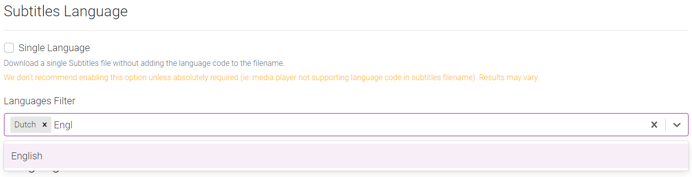 **We don't recommend enabling the Single Language option unless required (ie: media player not supporting language code in subtitles filename). Results may vary.
