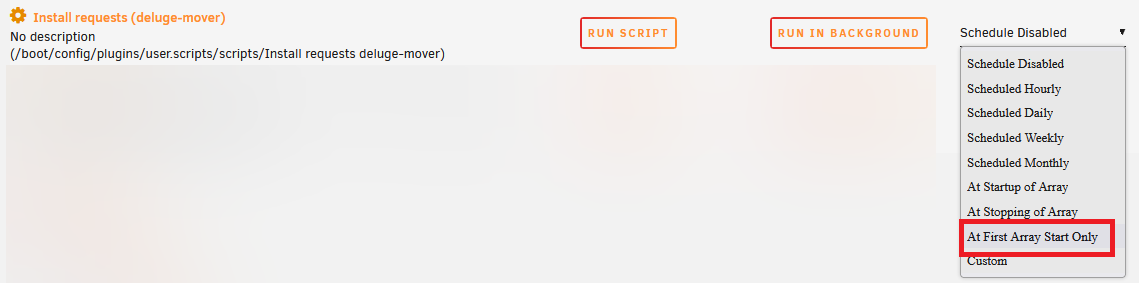 deluge-mover.py needs the requests Python module, so we need to make sure it's installed when your unRAID server starts, or when the Array is started the first time.