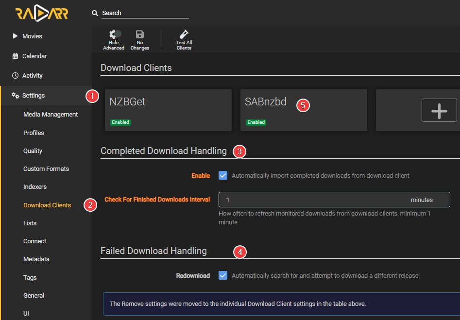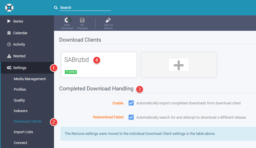 Select SABnzbd in step 4 and scroll down to the bottom of the new window where it says Completed Download Handling