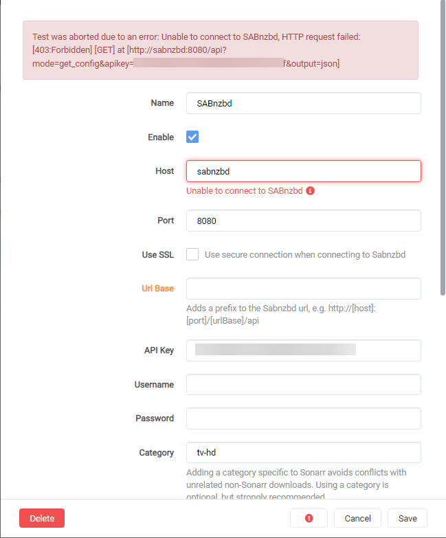 If you're trying to connect your Starr apps to SABnzbd and you're getting an error like Unable to connect to SABnzbd