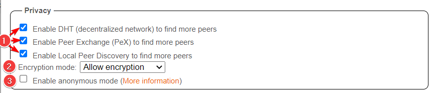 Anonymous mode hides the client's (qBittorrent) fingerprint from the peer-ID, sets the ‘User-Agent’ to Null and doesn’t share your IP address directly with trackers (though peers will still see your IP address). If using private trackers, it's recommended to