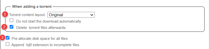 Pre-allocated disk space for the added torrents limits fragmentation and also makes sure if you use a cache drive or a feeder disk that the space is available.