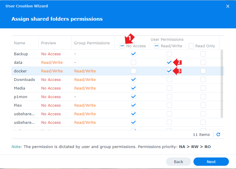 In the next screen, you will be able to select which Shares this user will have access to, click No Access