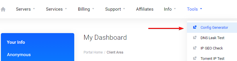 dashboard, go to your Config Generator