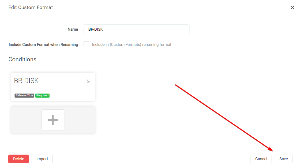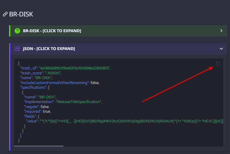 In this example, I will use the BR-DISK Custom Format, the one most people don't want to download anyway. And if you do, then you probably don't use any of the Starr apps or Plex, being both don't support it.