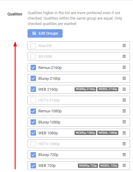 Qualities higher in the list are more preferred even if not checked. Qualities within the same group are equal. Only checked qualities are wanted.