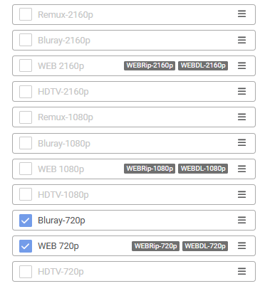 In the following screenshot, you will see a default order of your Quality Sources where the highest Quality would be a Remux-2160p